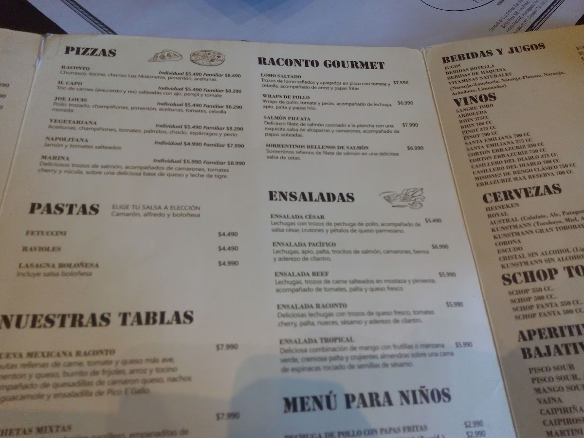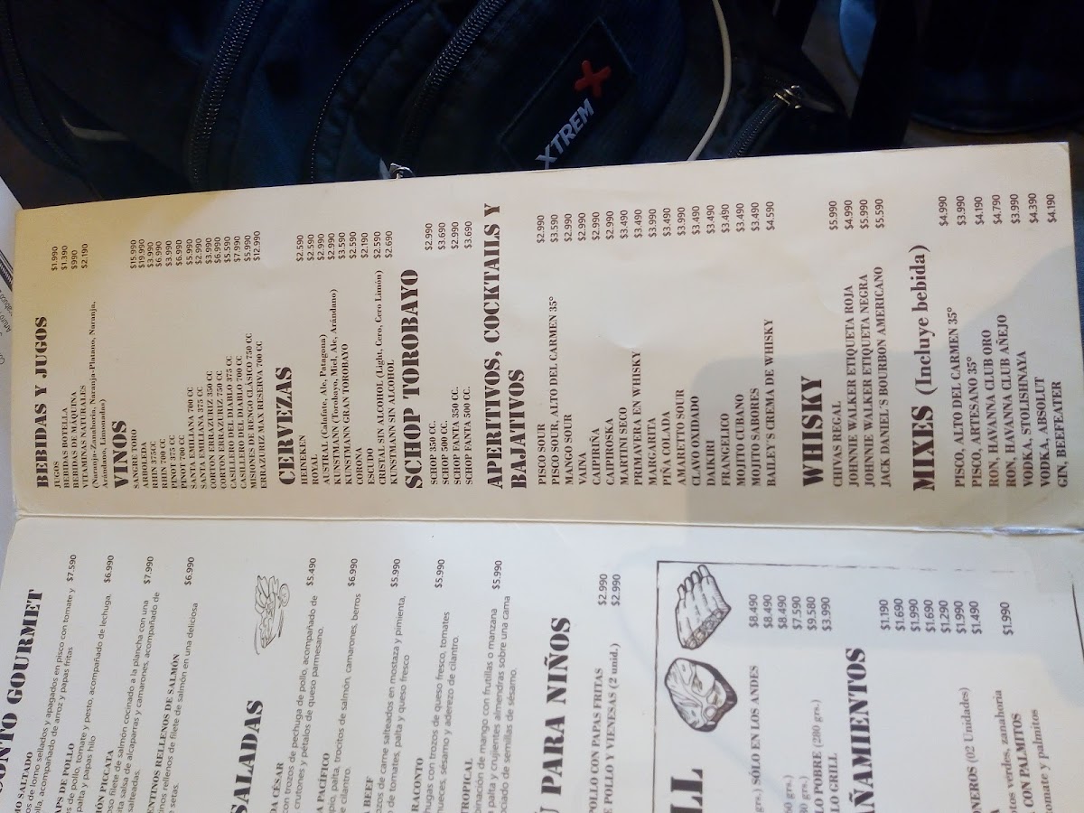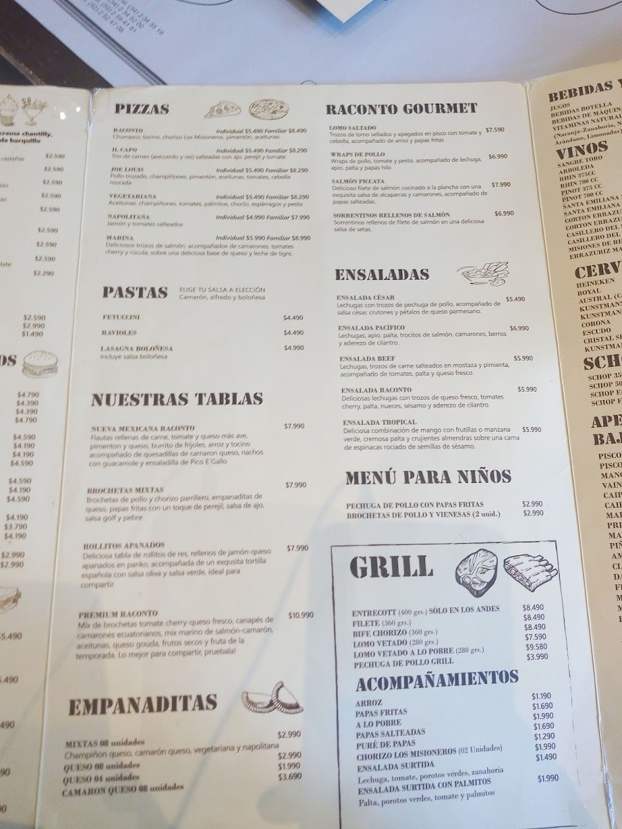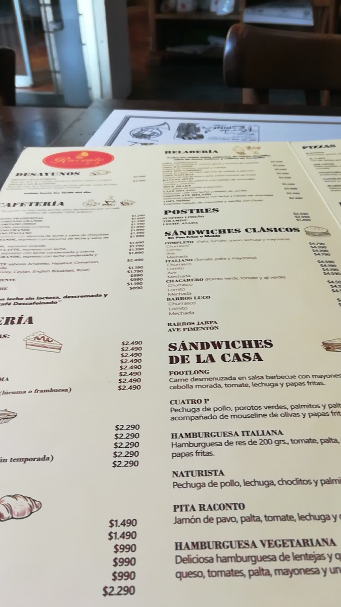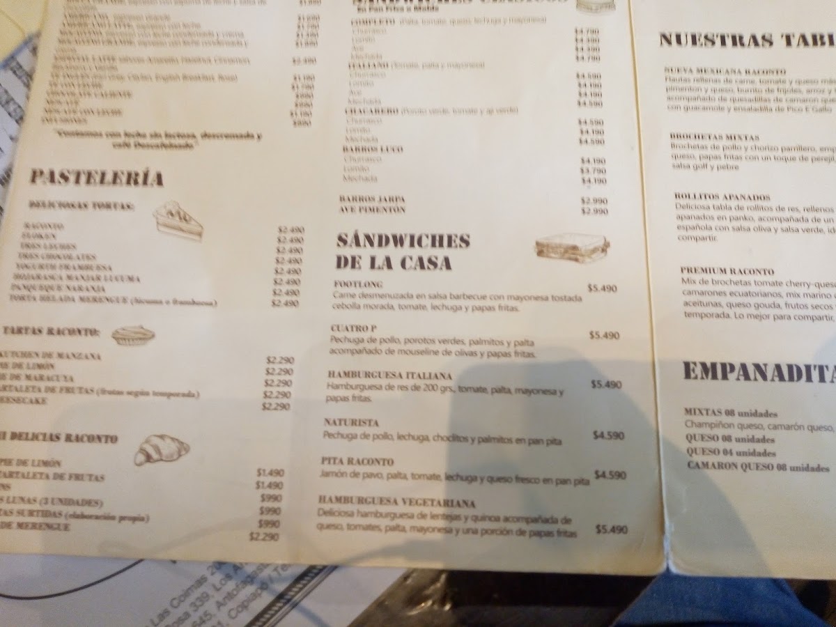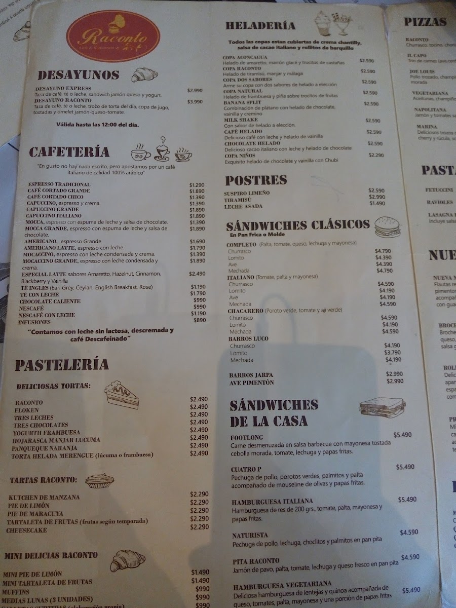 For food, the menu features traditional and light meal options. These include classic dishes such as lomo saltado and a range of pastas. Snack items include sandwiches like sandwich pollo palta and a selection of empanadas, including cheese varieties and assorted mini empanaditas. For sweet options, desserts such as torta helada, torta floken, and ice cream—including smaller portions designed for children—are offered.